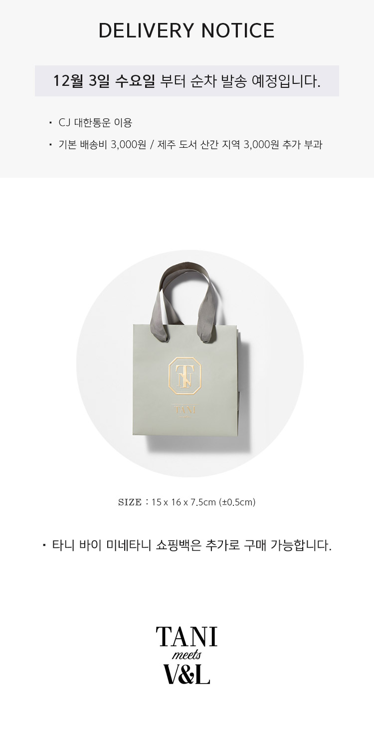 TANI BY MINETANI는 CJ 대한통운을 이용하며, 해외 배송 건은 우체국 EMS를 이용합니다. 배송비는 아래와 같습니다.